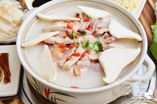 捞旺的火锅做法据说是传承于清朝时期,当时的一个妃嫔患有胃病,吃了猪肚鸡汤以后就得到了满足,从此以后,这个具有广东客家文化的特色菜就开始了传播。起初猪肚鸡汤只是在广东一带较为流行,后来经过改良在武汉变成了火锅,口味在传统的猪肚鸡汤的基础之上又进行了创新和研发,让人们吃火锅不仅能够吃到食材,还能够享受汤的鲜美。捞旺猪肚鸡的特殊之处就在于它的原料采用的是农家散养的老母鸡,加上优质的猪皮、排骨等一些优质食材,配上对身体有益的药材,让汤底的味道鲜香美味。
