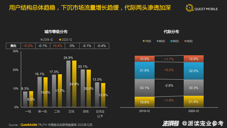 从数据可以看出:从2019年12月到2020年12月,移动互联网用户在一线到五线及以下城市中的比例基本稳定,在年龄结构上,70后和00后的占比明显增加,其中70后增加了1.8个百分点,00后增加1.7个百分点。