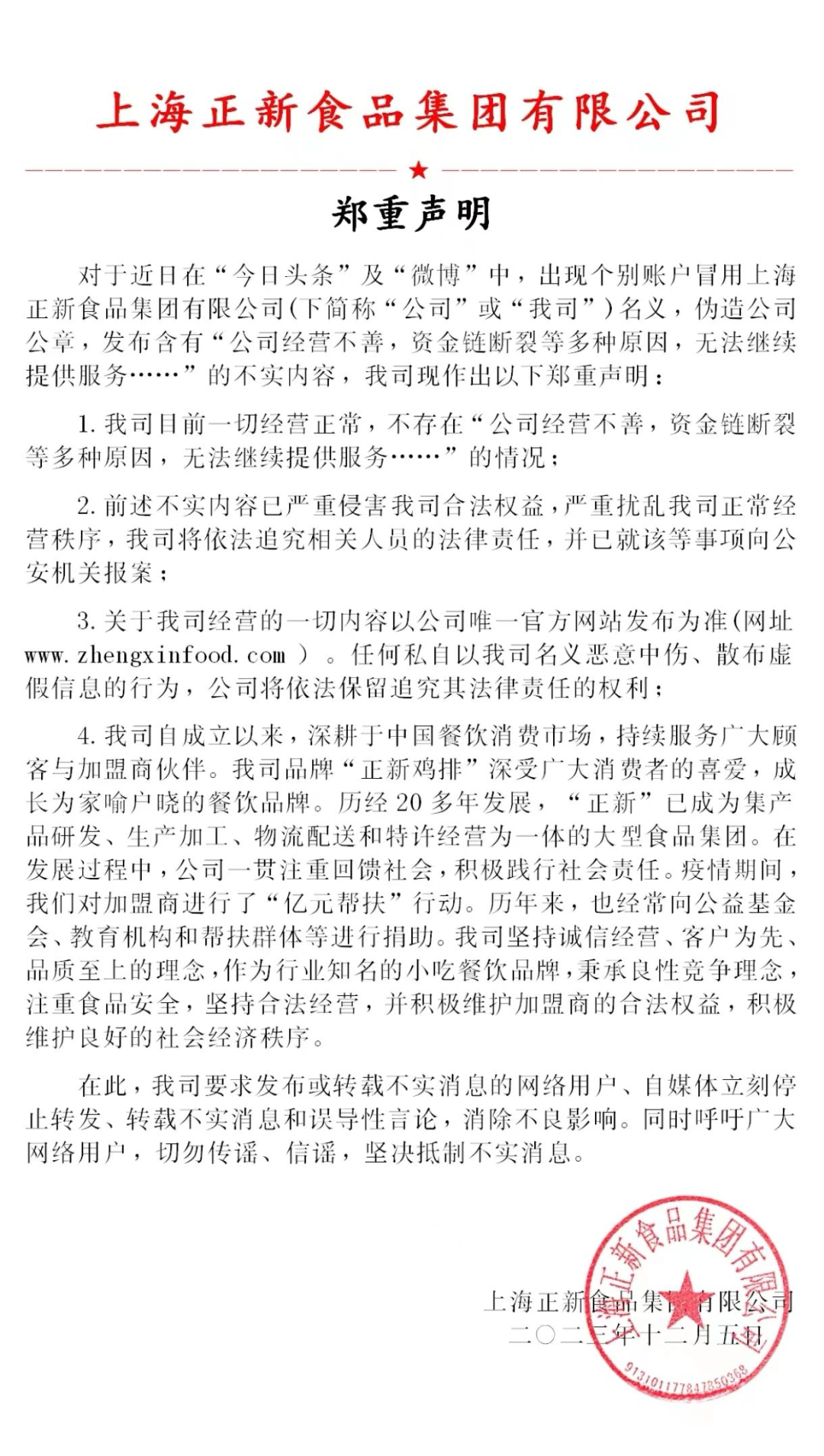12月5日深夜,针对近期网络不实内容,正新鸡排母公司正新集团发布声明称,对于近日在“今日头条”及“微博”中,出现个别账户冒用上海正新食品集团有限公司(下简称“公司”或“我司”)名义,伪造公司公章,发布含有“公司经营不善,资金链断裂等多种原因,无法继续提供服务……”的不实内容。