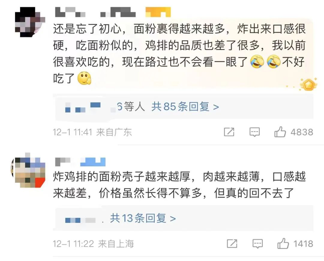 除价格上涨外,口感变差也成为网友议论的焦点。有网友评论称,正新鸡排“面粉壳子越来越厚,肉越来越薄,口感越来越差”。