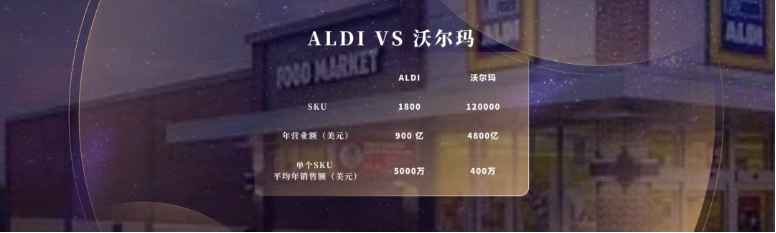 门店统一品类,保留少量SKU,与沃尔玛进行一个对比:ALDI的SKU是1800个,沃尔玛是12万个,但ALDI单个SKU平均年销售额高达5000万美元,沃尔玛为400万美元,ALDI用更少的SKU、更***的供应链来降低了单个产品的成本;