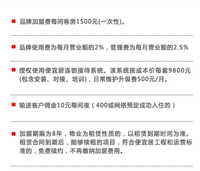 六、由便宜居连锁酒店管理(北京)有限公司提供品牌、经营管理,提供培训、管理督导、销售渠道;合作方规范经营管理和联网销售,风险自担。