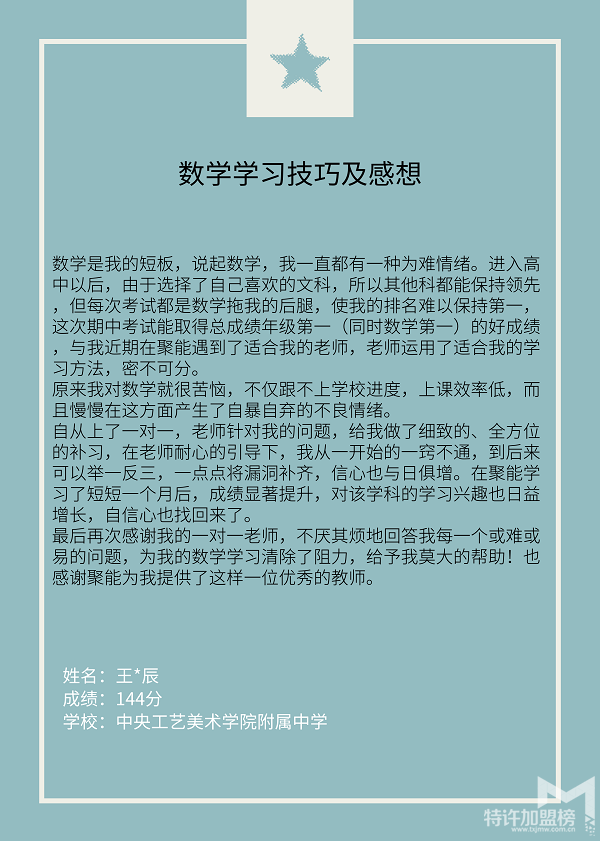 东直门校区王同学一举夺得了工美附中高三年级数学及全科第 一名,他说:“数学曾是我的短板,这次能拿到好成绩与我近期在聚能遇到了适合我的老师,老师运用了适合我的学习方法,密不可分。”来看看他的数学学习小技巧吧: