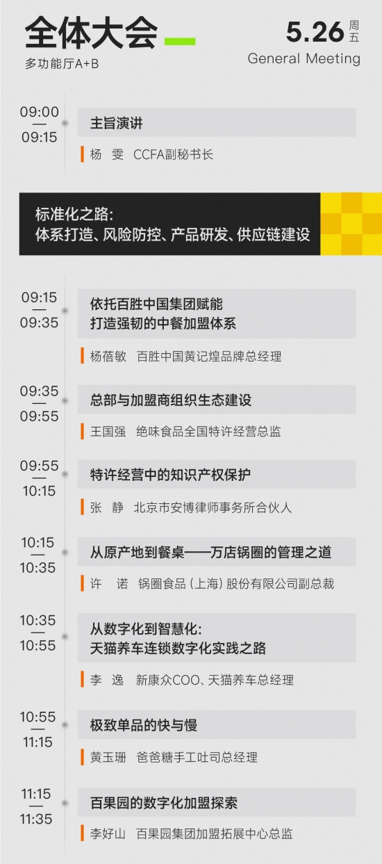大会结构分为全体大会和专题论坛两部分。其中,全体大会由“标准化之路”与“规模化之路”两大板块组成,分别围绕体系打造、风险防控、产品研发、供应链建设,品牌策略、跨界经营、客群开发、地域拓展等主题进行深入探讨;专题论坛则聚焦特许经营人才培训、常见法律问题、市场经营策略等实用主题。